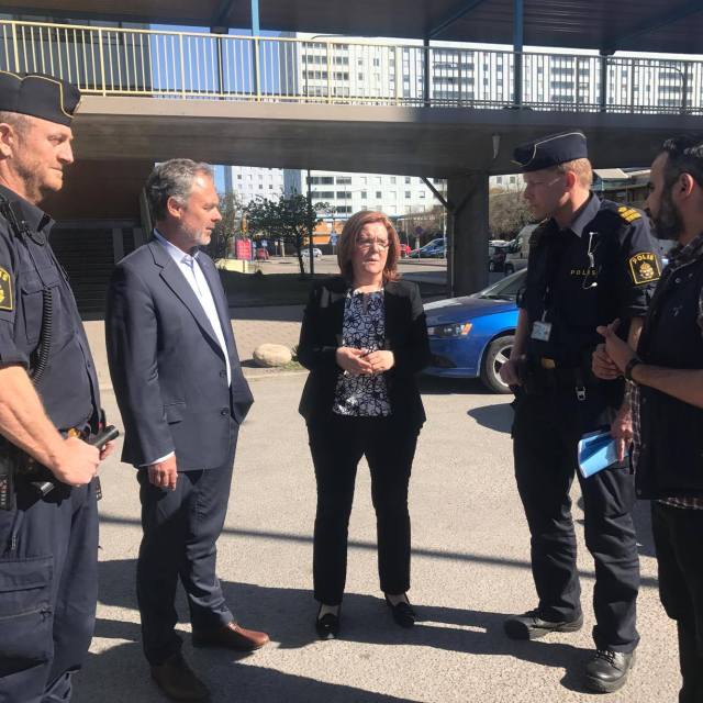 Jan Björklund gjorde ett studiebesök hos Solnapolisen och visades runt i staden av ett par Solna-liberaler – Marianne Damström Gereben och Sukrî Demir. Foto: Anne-Lie Elfvén.