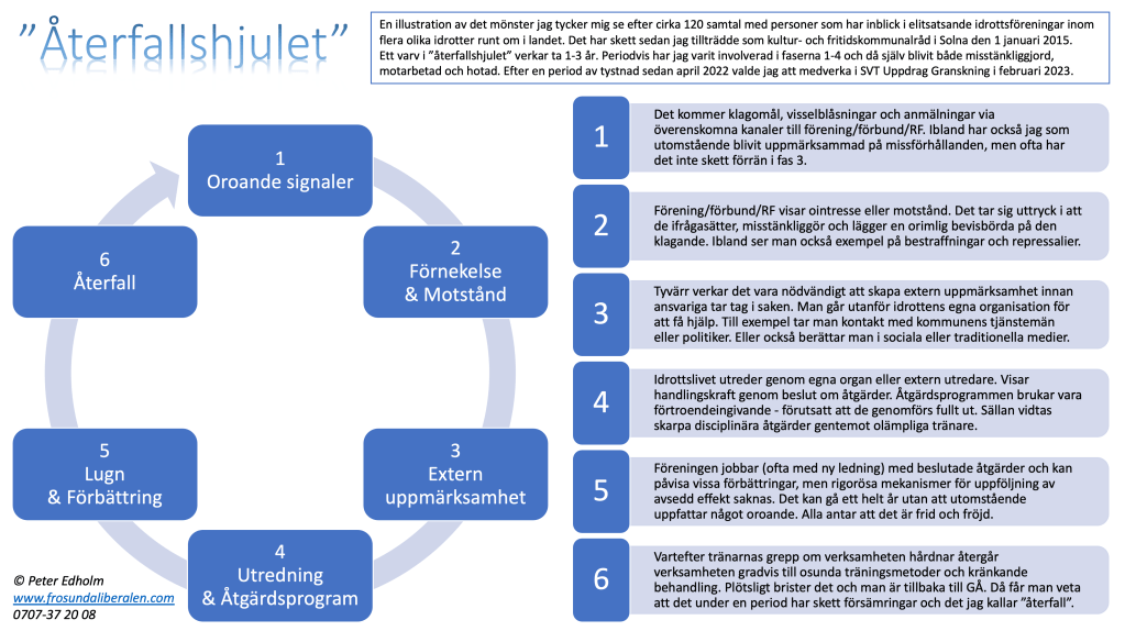 Varför tackade jag ‘ja’ när Uppdrag Granskning ville intervjua mig? Jag har ju vid flera andra tillfällen det senaste året avböjt att kommentera konståkningens problem när olika medier har hört av sig. Efter den intervju jag gav i Dagens Nyheter för snart ett år sedan har jag legat lågt. Bland annat för att företrädare för konståkningsidrotten (både lokalt och nationellt) har påpekat att medial uppmärksamhet försämrar deras möjligheter att lösa grundproblemet. Under en period har jag förlitat mig på det, backat undan och förväntat mig att man jobbar på med sin åtgärdsplan. Under våren och sommaren 2022 nåddes jag inte heller av några oroande signaler.