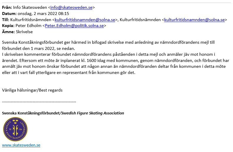 Den 2 mars 2022 fick jag följande uppseendeväckande mejl från Svenska Konståkningsförbundet.
